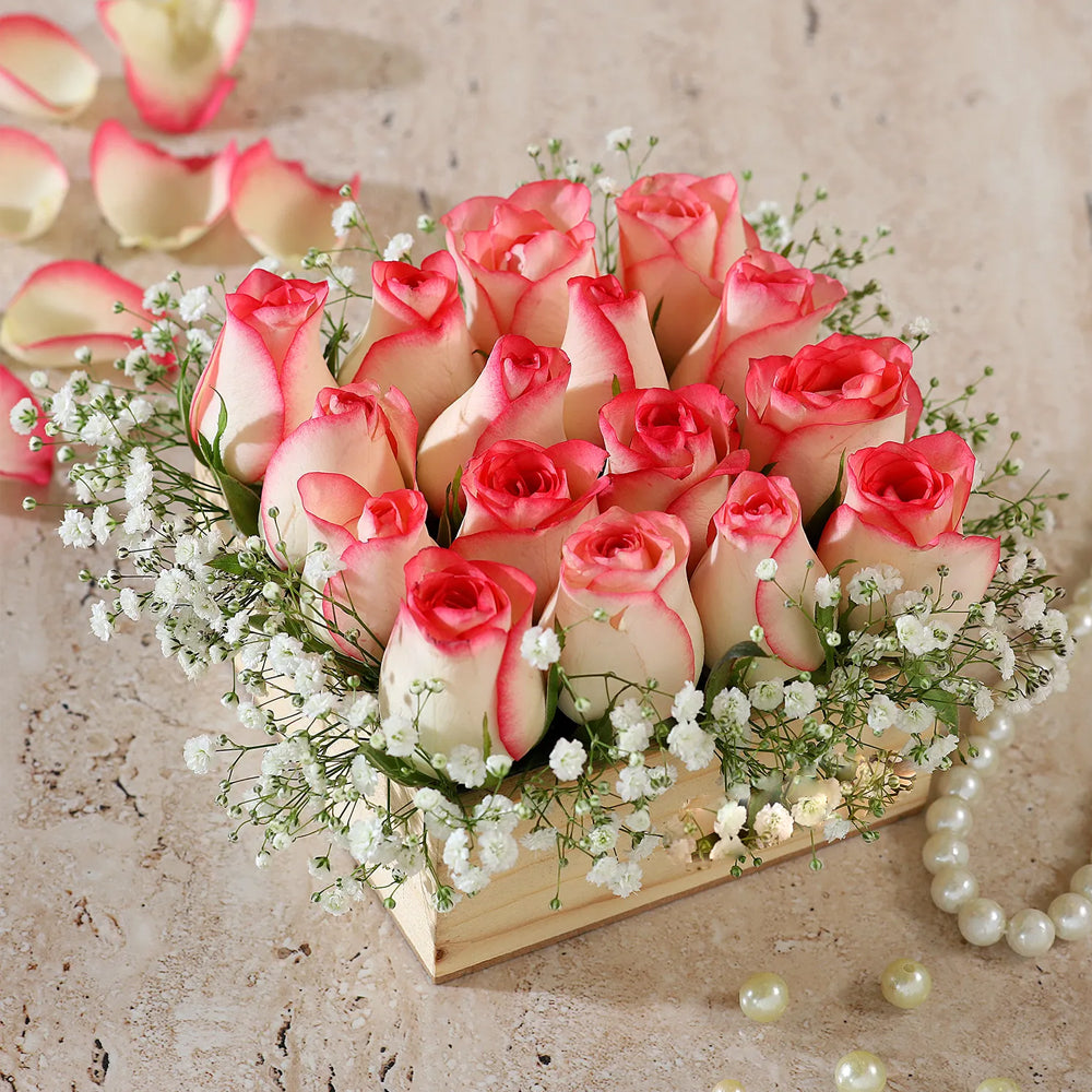 Friendship Day - 16 Pink Roses Arrangement In Wooden Base